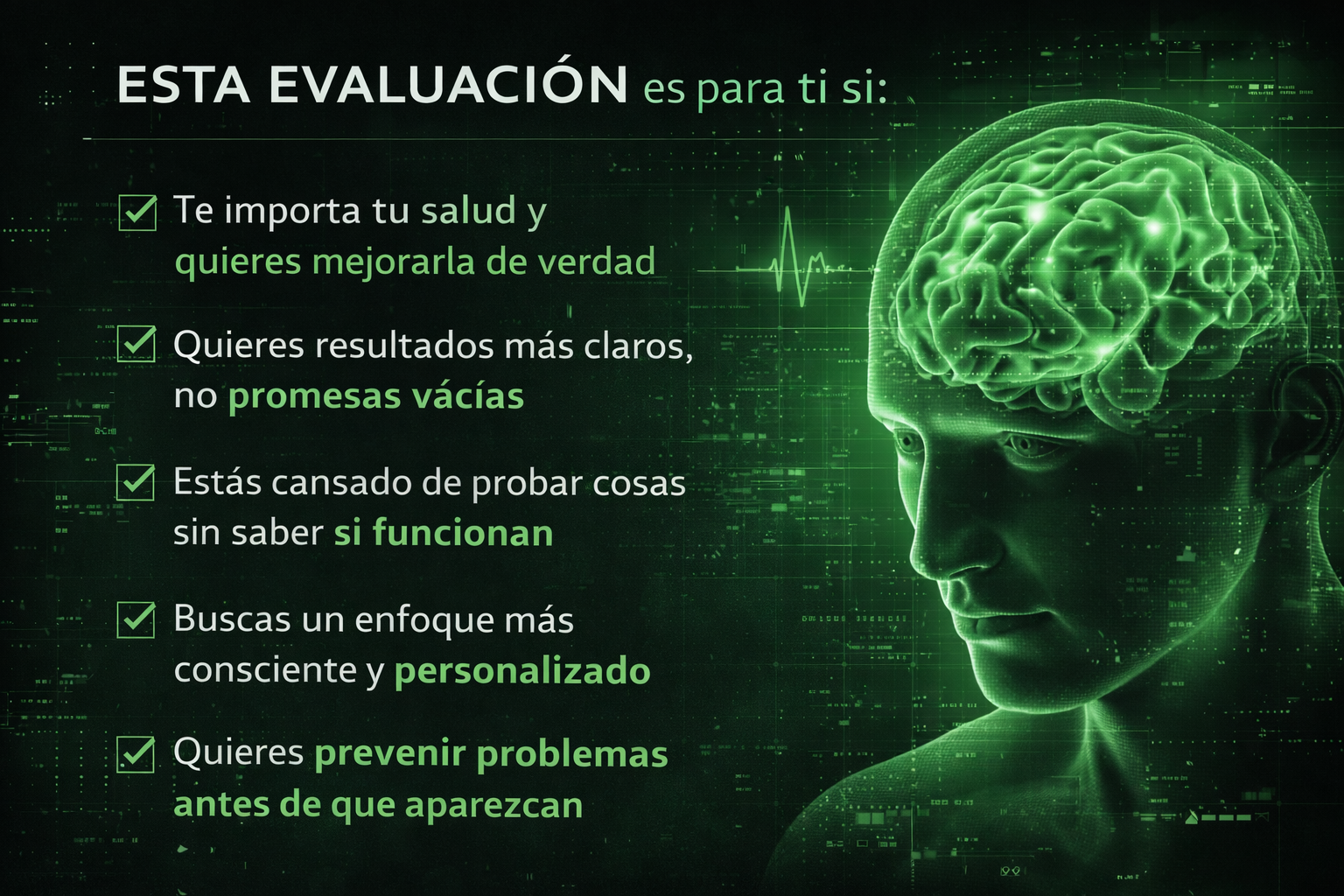 No. El escaneo no sustituye estudios médicos ni diagnósticos clínicos. Es una herramienta de orientación y bienestar que te ayuda a tomar mejores decisiones sobre tu estilo de vida y cuidado personal.