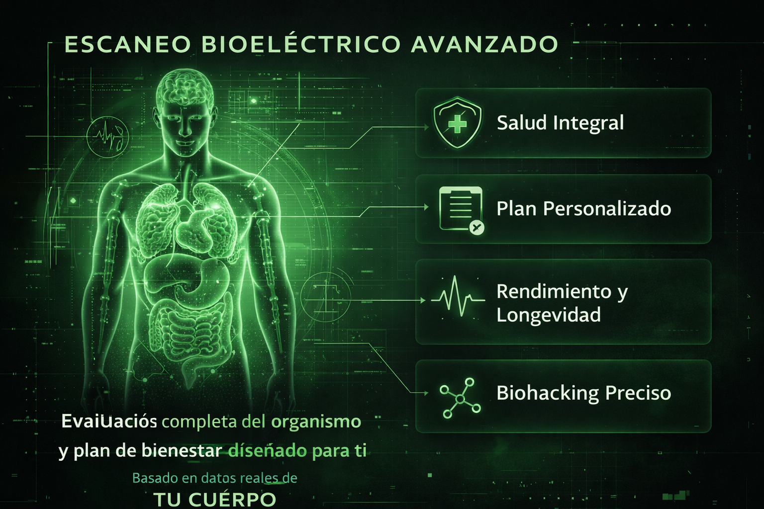 Con nuestro Escaneo Bioeléctrico Avanzado, obtienes una evaluación completa de tu organismo y un plan de bienestar diseñado para ti, basado en datos reales de tu cuerpo.